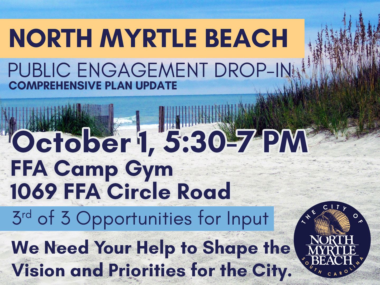 The Comprehensive Plan Community Survey, open now through Wednesday, October 8, provides an additional way for community members to offer valuable feedback. This feedback will help shape the vision and priorities for the future of North Myrtle Beach.