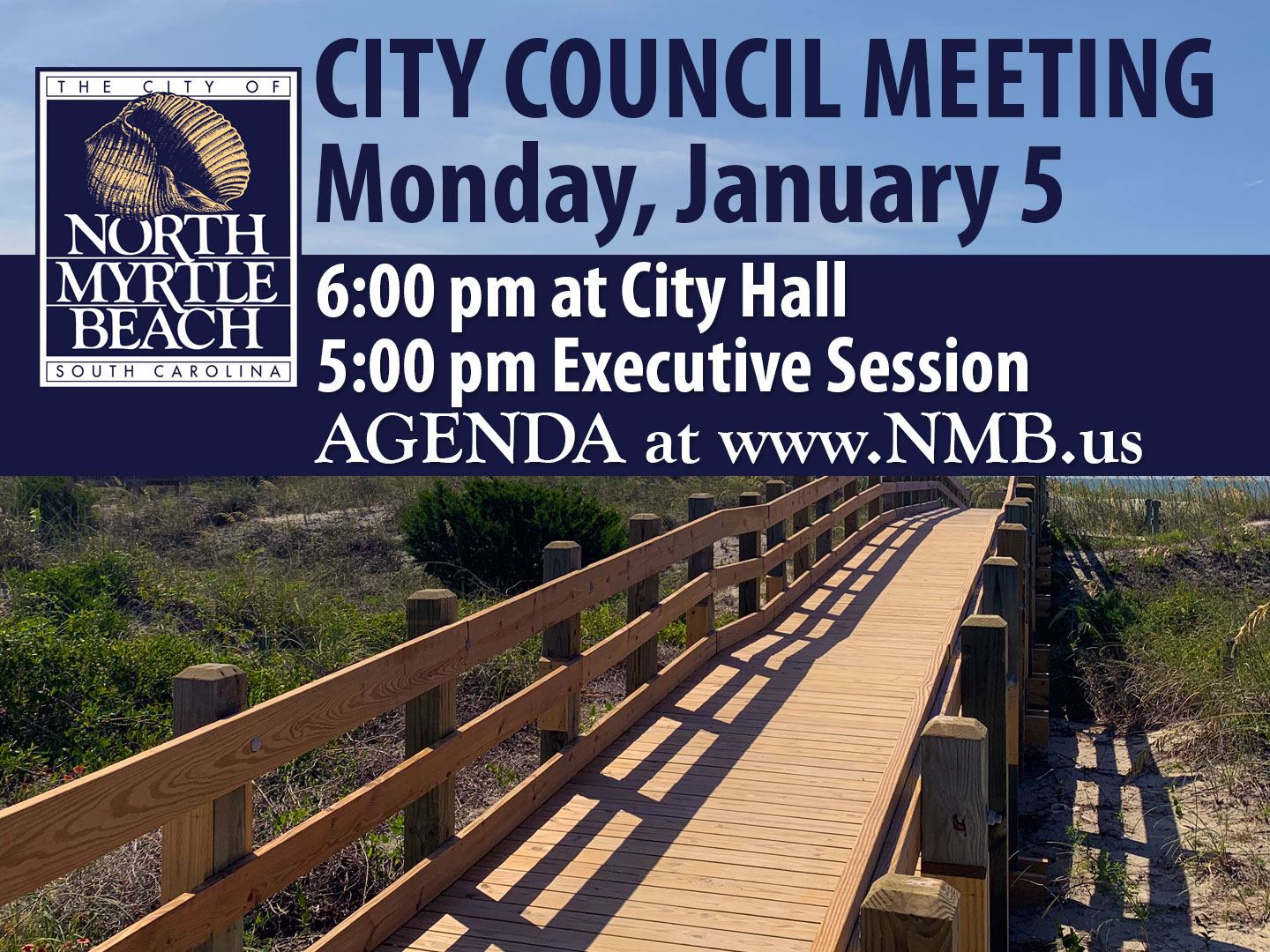 NORTH MYRTLE BEACH, S.C. -- The North Myrtle Beach City Council will meet in a regularly scheduled meeting on Monday, January 5, at 6:00 PM at City Hall.